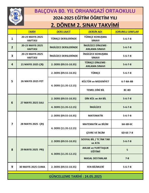 2024-2025 2. Dönem 2. Sınav Tarihleri (Güncelleme 24.05.2025)
